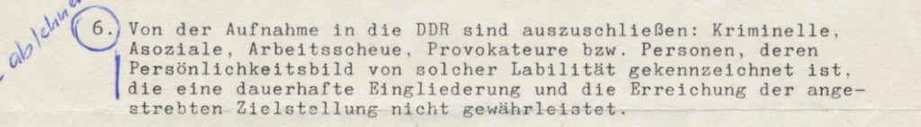 „Damit wird erneut die prinzipielle Gültigkeit der Sprecher-Erklärung des MfAA(Außenministerium der DDR, P.R.) vom 05. April 1984 unterstrichen, wonach den Bitten um Gestattung der Rückkehr in die DDR – so verständlich sie auch sind – grundsätzlich nicht entsprochen wird. Die Aufnahme und Wiedereingliederung ausgewählter Personen erfolgten nur in begründeten Einzelfällen.“