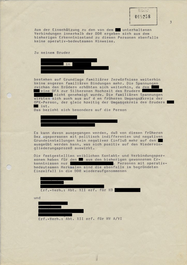 Dann geht es um familiäre Zerwürfnisse und irgendwelche Freundinnen, die für das MfS interessant waren und ebenfalls „im begründeten Einzelfall“ wiederaufgenommen wurden.