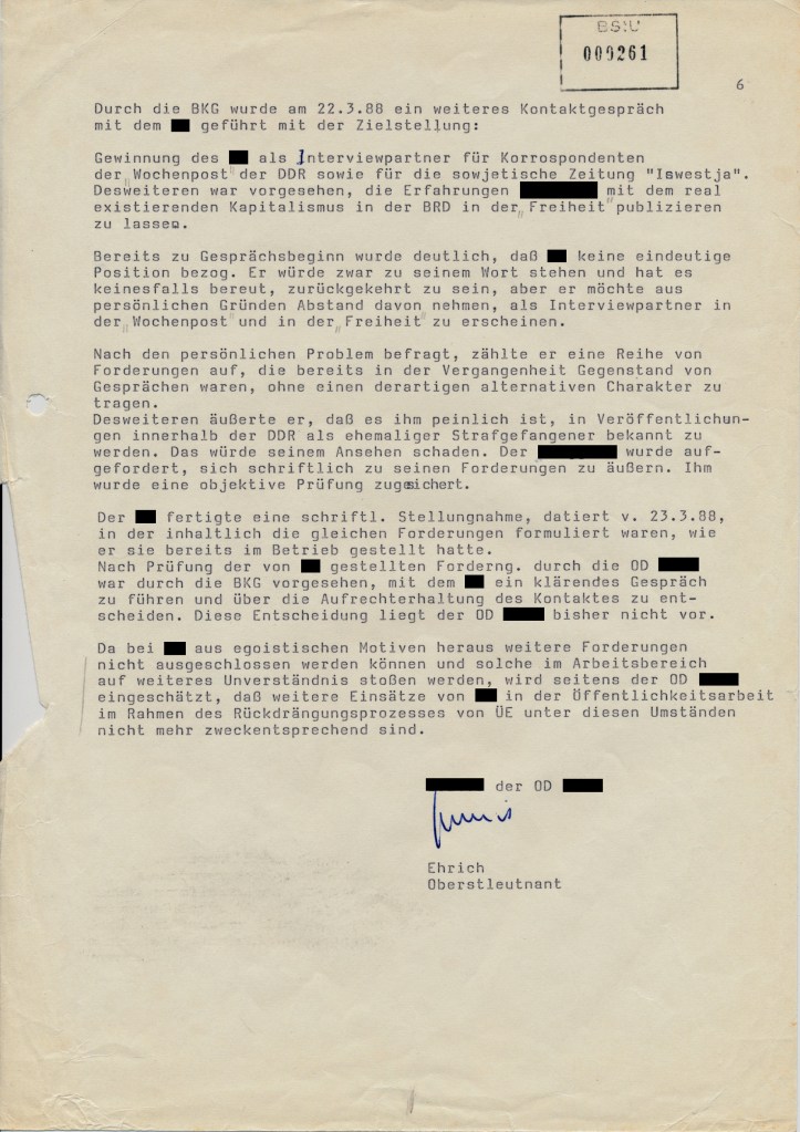 Das MfS stellte fest, dass dieser Mensch keine Forderungen stellen wird und bereit wäre dahingehend mitzuwirken, dass die Übersiedlungsersuchen von Bürgerinnen und Bürgern der DDR in die BRD zurückzudrängen.
