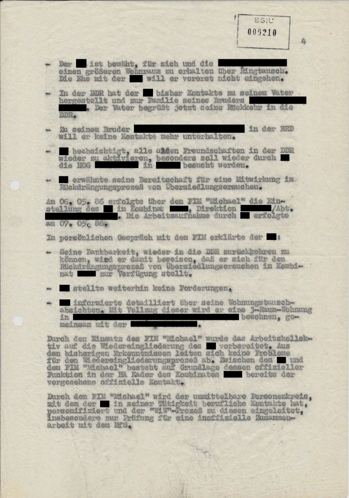 Dann wieder der Widersinn, dass die Aufgenommen mitwirken sollten, dass Bürgerinnen und Bürger der DDR davon Abstand nehmen sollen einen Ausreiseantrag in die BRD, bzw. Westberlin zustellen. Andererseits wieder sollen Übersiedlungsabsichten von Bürgerinnen und Bürgern der BRD und Westberlins zurückgedrängt werden. Ein Leben unter der Käseglocke, niemand raus und niemand rein. Auch wenn es aus Sicherheitsgründen notwendig war, das konnte es auf die Dauer nicht gut gehen. Es fehlte das „frische Blut“. Wenn mehr Einwanderungs- und Rückkehrwillige aufgenommen worden wären, hätte es 1989 wohl etwas anders ausgesehen.