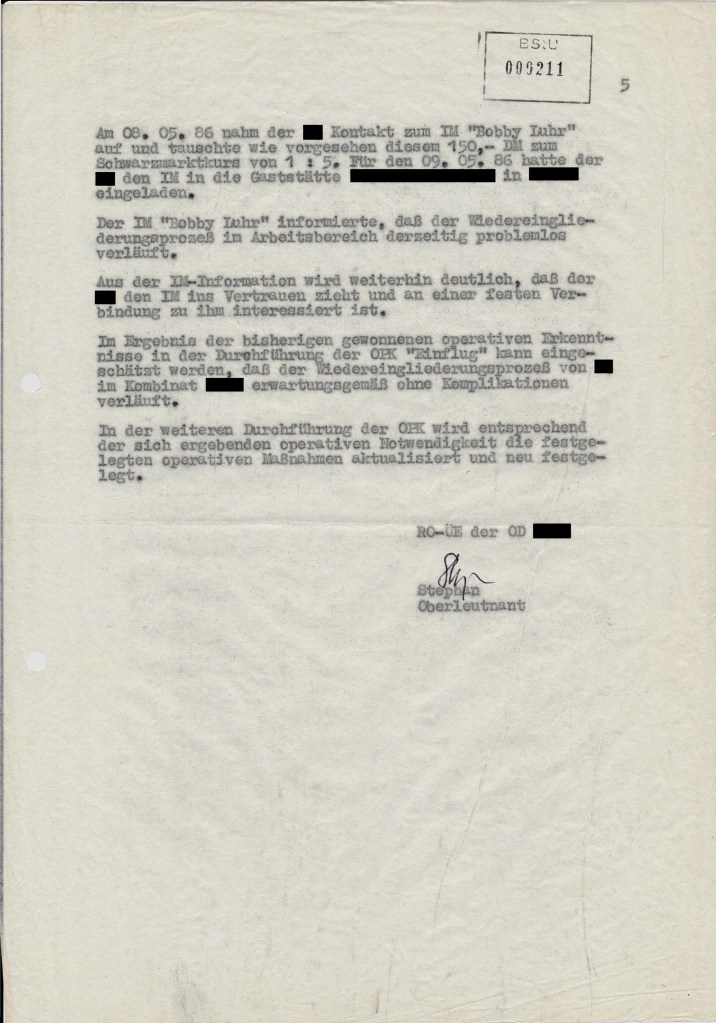 Am 08.05.1986 nahm dieser Mensch zum Kontakt zu dem IM auf, um, wie vorgesehen, das Geld zu tauschen. Ahhh, hier hatte dieser Geldtausch einen Zweck. Dieser IM gab die Info weiter, dass der Wiedereingliederungsprozess am Arbeitsplatz problemlos verlief.