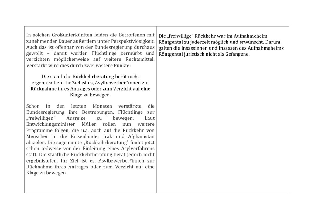 In solchen Großunterkünften leiden die Betroffenen mit zunehmender Dauer außerdem unter Perspektivlosigkeit. Auch das ist offenbar von der Bundesregierung durchaus gewollt – damit werden Flüchtlinge zermürbt und verzichten möglicherweise auf weitere Rechtsmittel. Verstärkt wird dies durch zwei weitere Punkte: